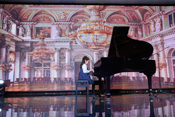 Không gian hội trường được phủ một màu xanh ngọc bích huyền ảo, điểm xuyết ánh đèn vàng ấm áp tựa khung trời đêm đầy sao. Từng em nhỏ trong trang phục dạ hội lấp lánh bước lên sân khấu, nơi cây đàn piano grand chờ đợi. Những ngón tay bé xíu lướt trên phím đàn, biến những bản nhạc cổ điển của Mozart, Beethoven thành câu chuyện thần tiên bằng âm thanh.